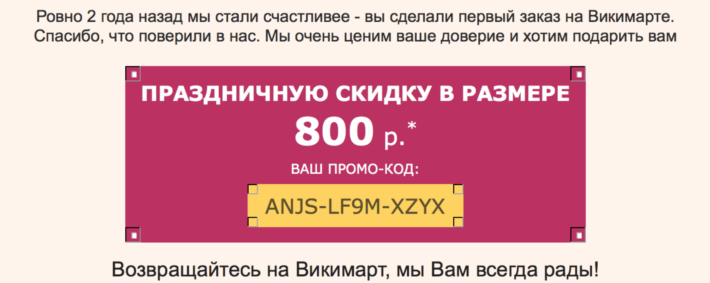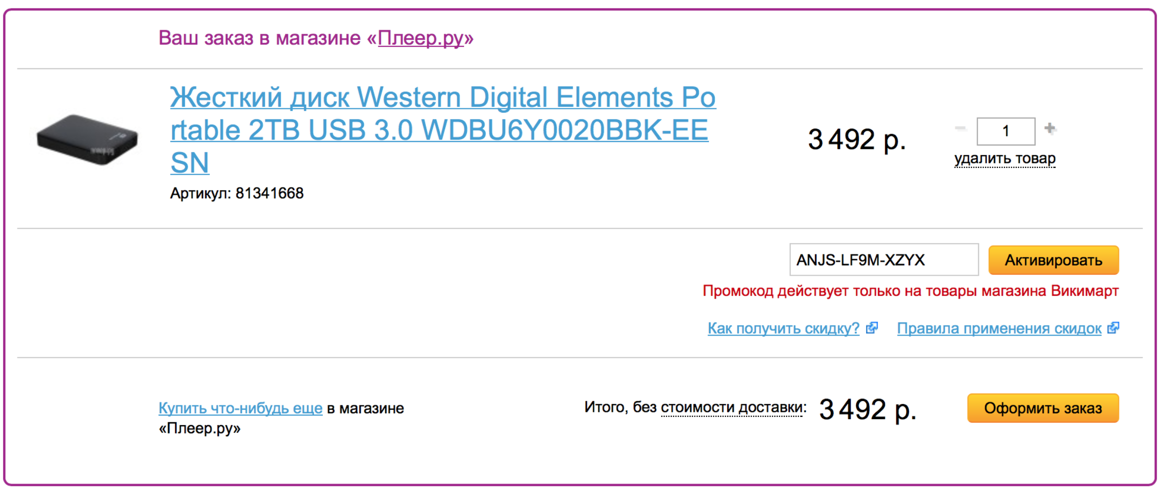 Раскатываю губу, ввожу код “подарка” — упс! — не канает: “Промокод действует только на товары магазина Викимарт”: