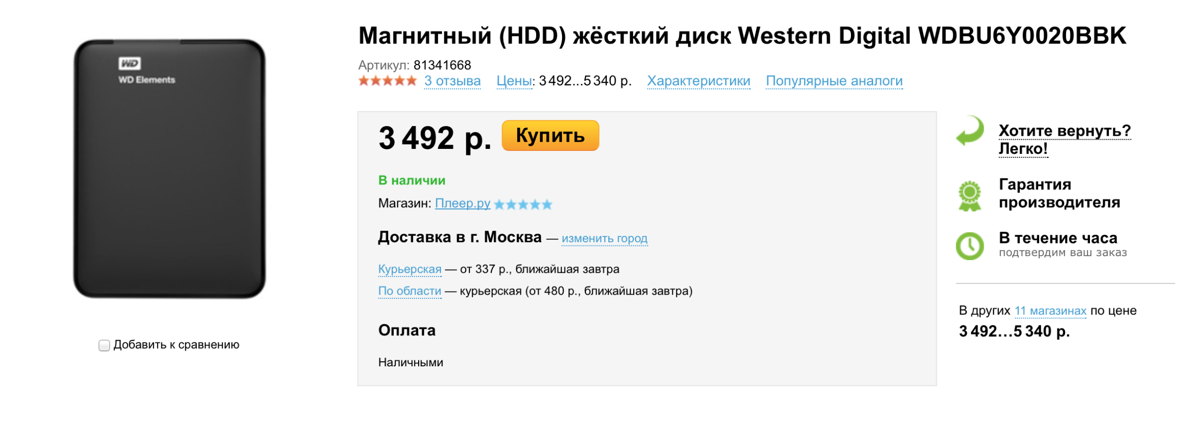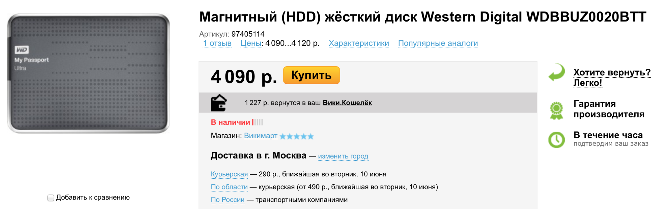 Ну что ж, привалило мужику счастья — отправляюсь получать подарок. Что бы такое купить в Викимарте? Как что? Лучший подарок завернутому на гаджетах обывателю — жесткий диск! Мой любимый — 2-гиговый WD Elements 2.5 дюйма (у меня их уже четыре — никак не нарадуюсь). Ищу диск в Викимарте и быстро нахожу его в списке на первой позиции по цене (для тех, кто не в курсе, Викимарт — это не только дисконт-магазин, но еще и посредник-перекупщик, поставляющий товары из других магазинов):