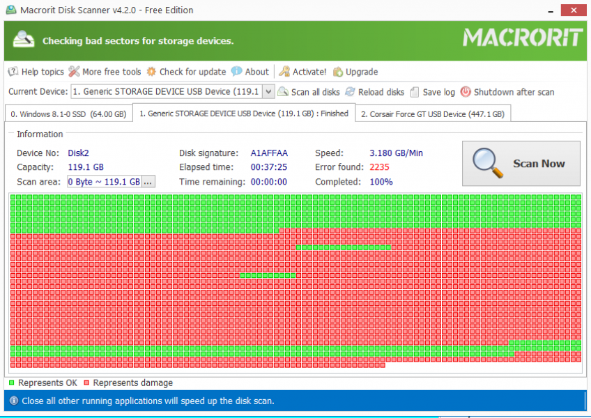 HDD Low Level Format Tool трудился над моей карточкой около пяти часов (!) после чего сканирование в Macrofit Disk Scanner выдало такой вот ошеломительный результат: