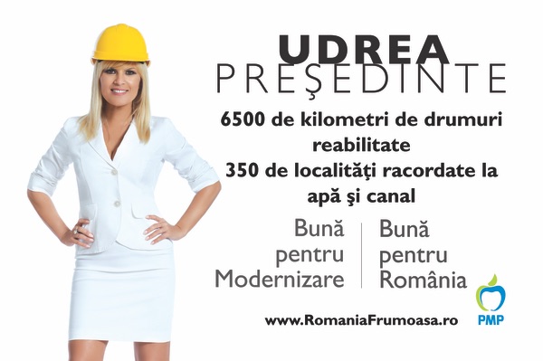 Но, похоже, переусердствовали. Странно, что имиджмейкеры не уловили двусмысленность текста: «Удря Президент. 6500 километров восстановленных дорог, 350 населённых пунктов, подключённых к канализации и водопроводу. Она хороша для Модернизации. Хороша для Румынии». Речь шла о достижениях Елены Удра в должности министра регионального развития и туризма. Но фраза «Хороша для Румынии» звучит таки игриво.