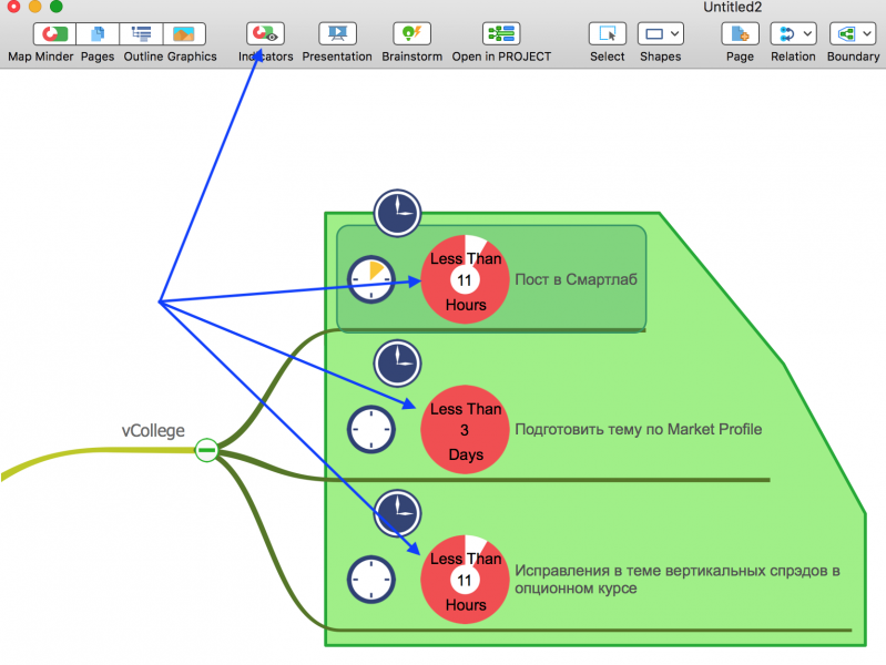 Indicators позволяет включить визуальное распознавание на интеллект-карте для всех её элементов типа Task (Задачи), после чего пользователь сразу видит, какие дела у него на подходе: