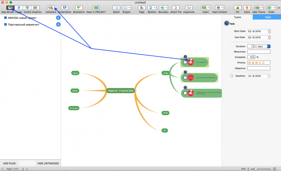 Интересное нововведение в MINDMAP 10 в области деловых карт — это панель Map Minder и режим Indicators.