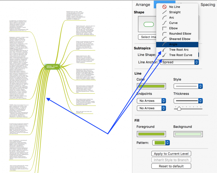 В новой MINDMAP 10 этот эффект достигается минимальными усилиями: появились два новых дизайна «хвостов» — Tree Root Arc (он как раз представлен на скриншоте) и Tree Root Curve: