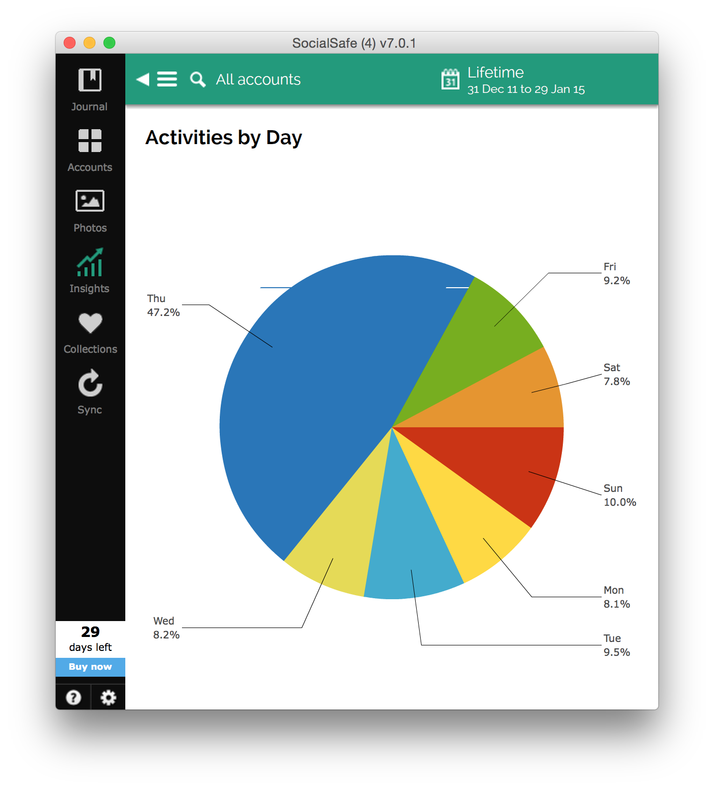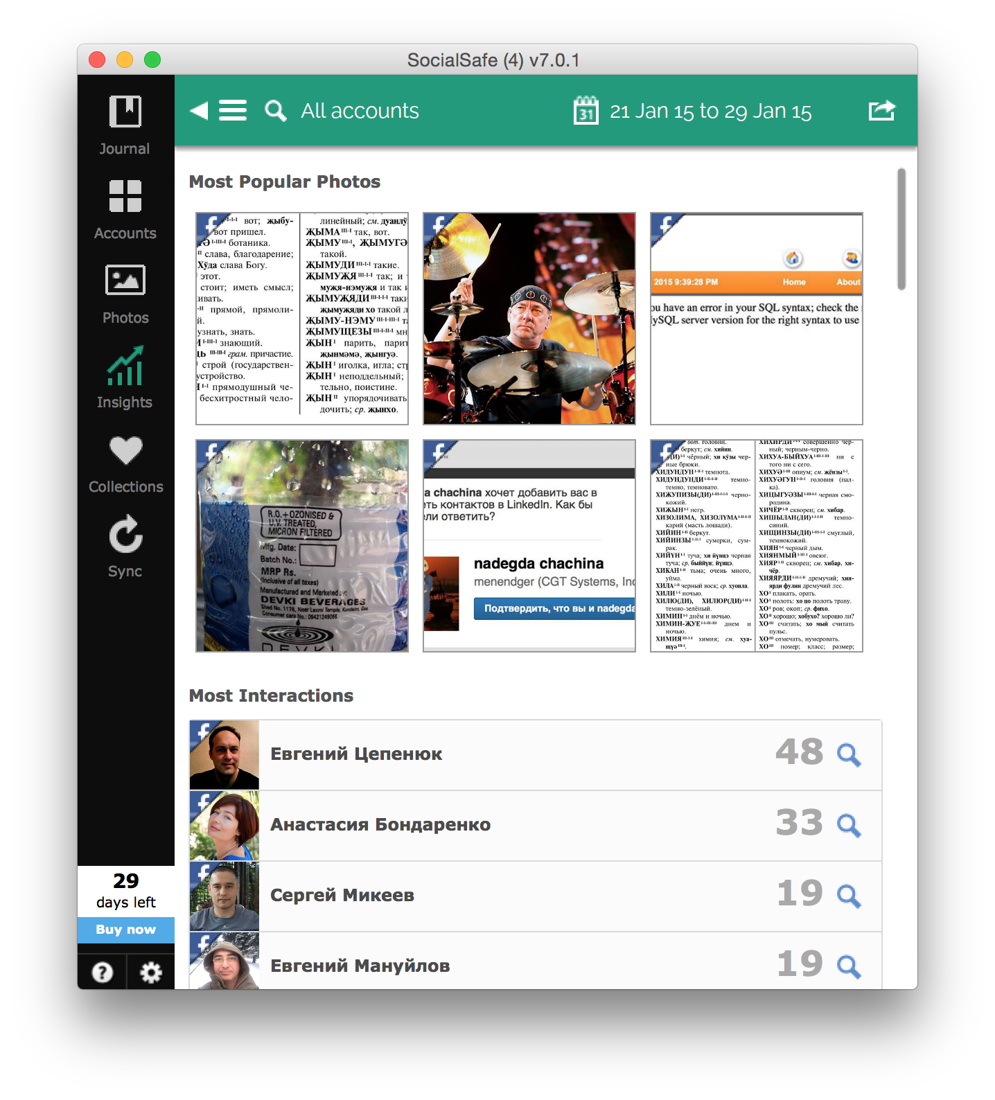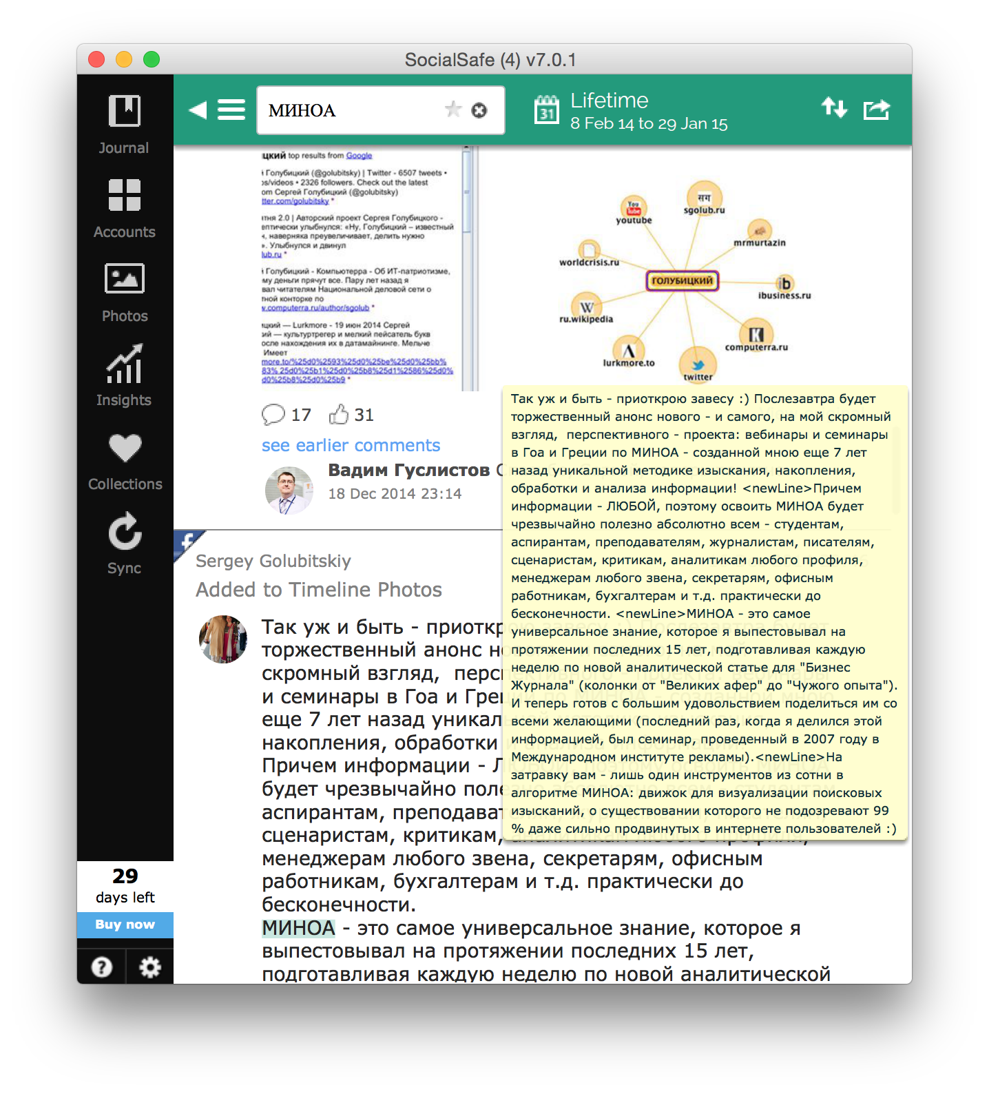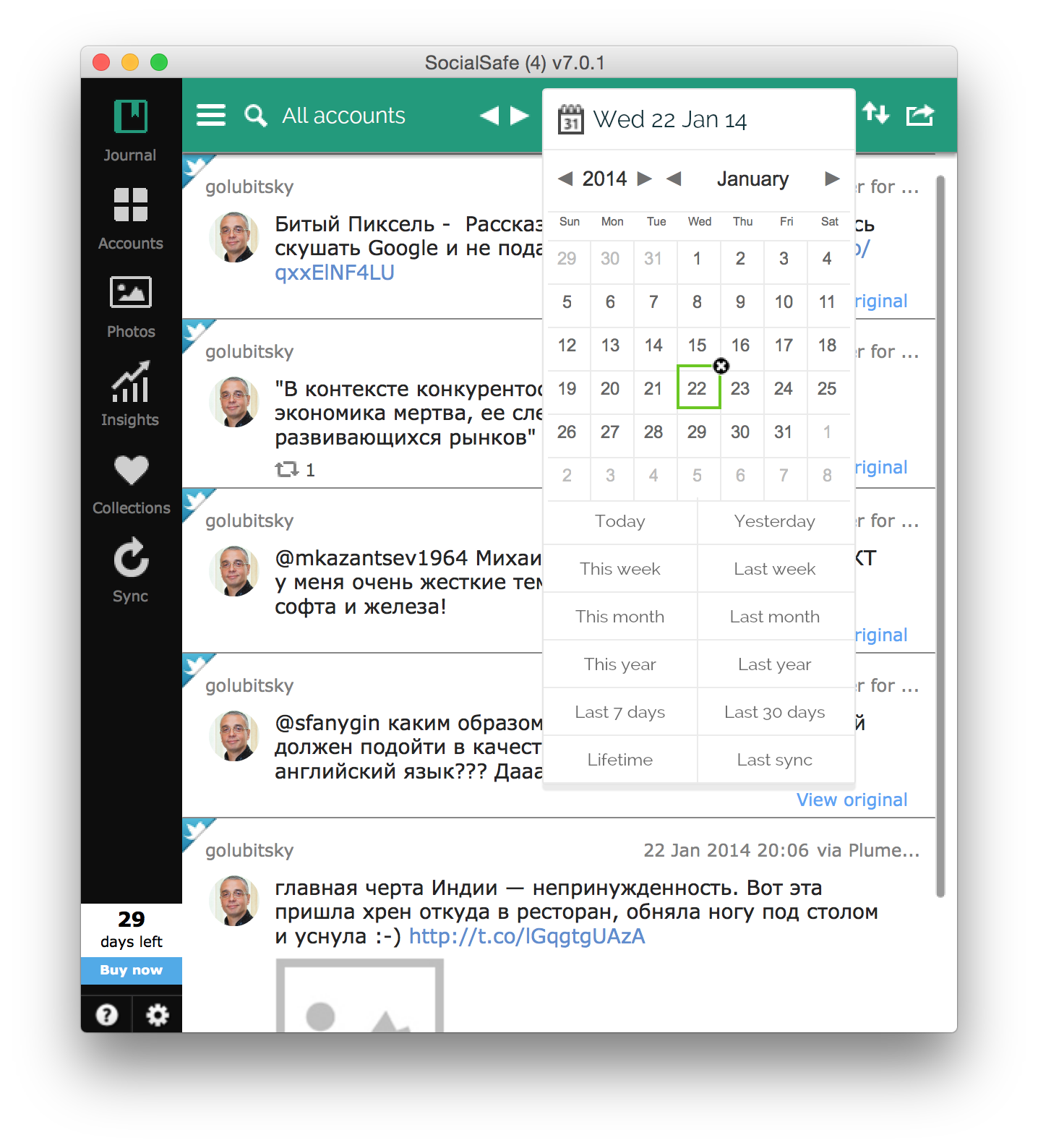 Я уже помянул встроенный в программу индекс и опцию поиска как в полном информационном массиве, так и в различных его разделах. Шикарная возможность временной локализации информационных потоков реализована в функции SocialSafe Journal, которая позволяет выбрать любую дату и просмотреть всю активность, какая была зафиксирована в тот день по всем вашим социальным сетям.
