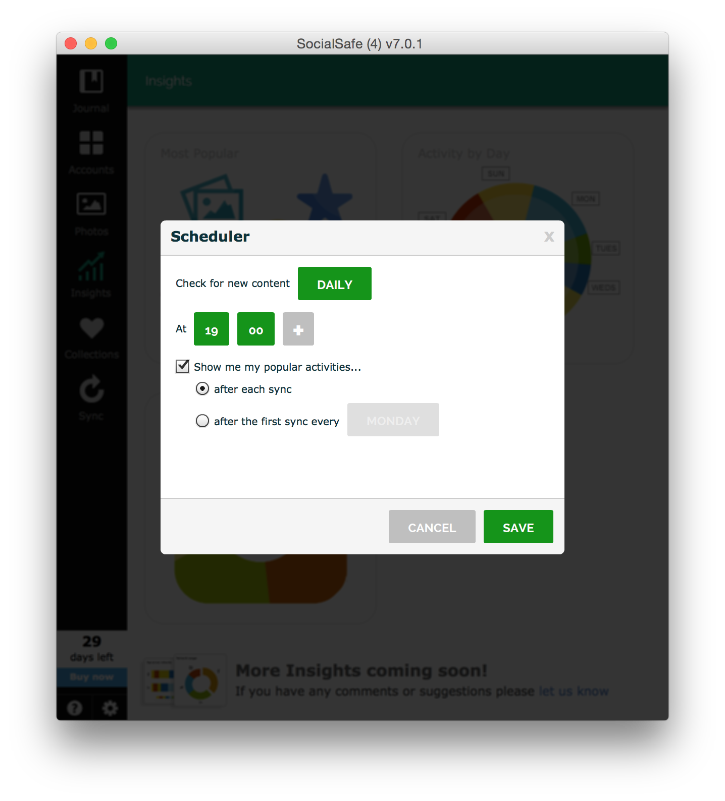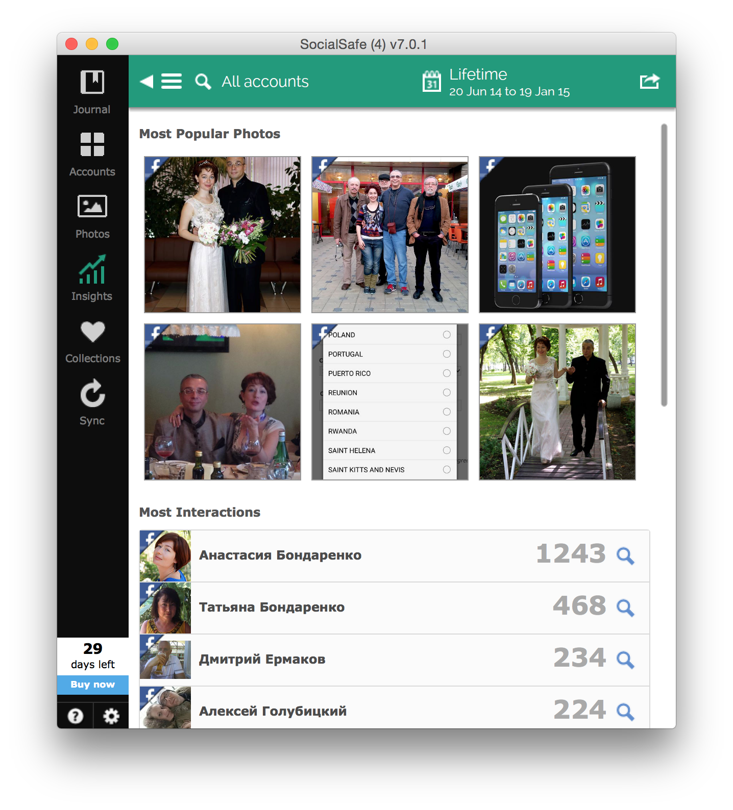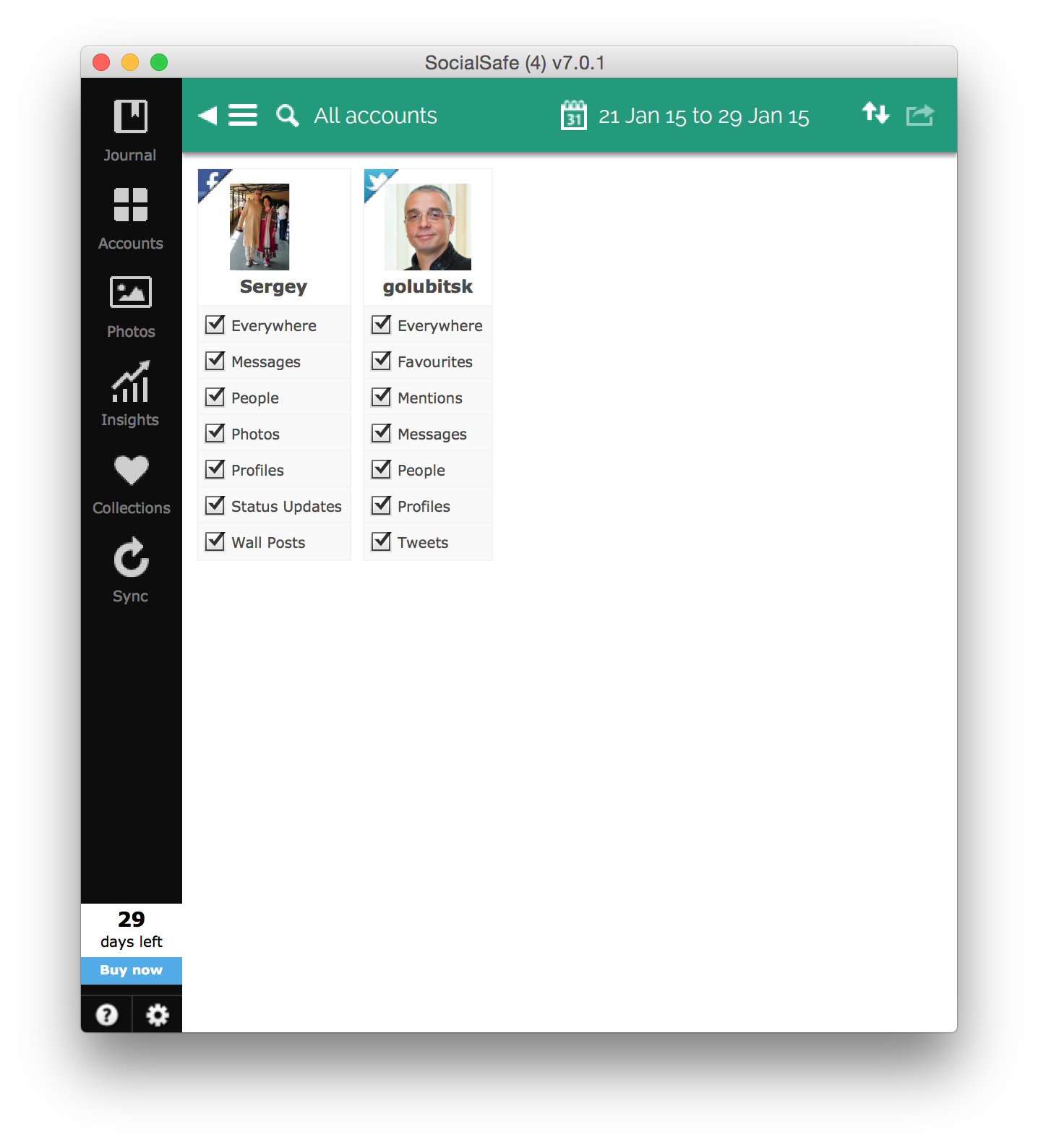 SocialSafe существует в двух ипостасях – бесплатная подписка на услуги, позволяющая создавать резервные копии 4 аккаунтов в социальных сетях, защищать бэкап паролем, экспортировать фотографии и статусы, а также на протяжении 30 дней пользоваться всем функционалом премиального аккаунта.