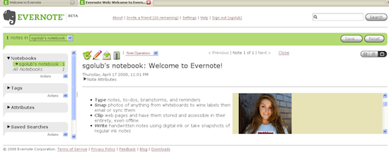 На какое-то время программа совершенно исчезла с радаров регулярных обновлений: как оказалось, разработчики серьезно химичили с глобальным позиционированием своего детища. В конце концов Evernote определился и сделал ставку на облачное будущее компьютерной жизни. В 2008 году программа вернулась на рынок в совершенно измененной инкарнации: серверного хранилища пользовательской информации, да к тому же в веб-интерфейсом! Скриншот этой второй инкарнации у меня сохранился, потому что был опубликован в Голубятне «Глоток свободы на глубине двух метров»: