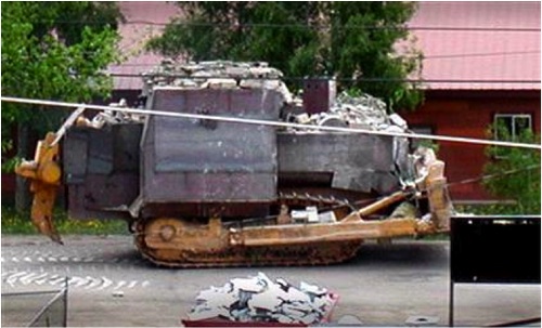“…в 2002 году он приобрел гусеничный бульдозер Komatsu D355A, который на протяжении двух лет переоборудовал в мобильную крепость: установил броню, которая достигала 30 сантиметров в толщину, оборудовал для обзора несколькими видеокамерами, которые подключил к двум дисплеям, размещенным в кабине. Объективы камер были защищены пуленепробиваемым пластиком 7-сантиметровой толщины. Наладил систему кондиционирования воздуха в кабине, а с помощью сжатого воздуха добился автоматической очистки от пыли видеокамеры.”