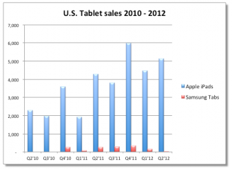 Ну так, собственно, о 37 тысячах никто и не рассказывает: говорят все больше о триумфальных миллионах :) И тут мы плавно возвращаемся в самое начало моего пятничного поста :)Красные микроскопические столбики справа – это и есть продажи планшетов Samsung в США в период с 2010 по 2012 годы.