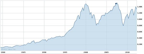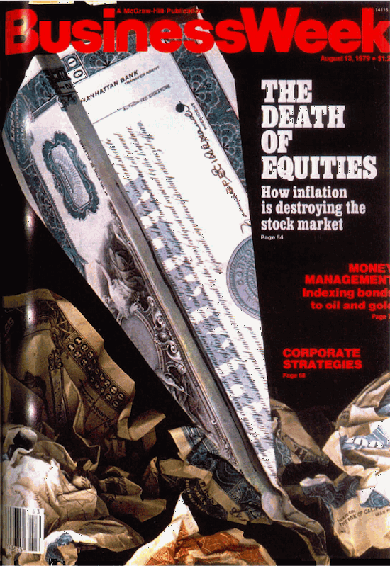 Перед нами BusinessWeek выпуска 13 августа 1979 года. С точно таким же слоганом: «СМЕРТЬ АКЦИЙ!» После столь многообещающего анонса случилась, однако, маленькая нестыковка: рынок акций перешел к такому умопомрачительному росту, что на его фоне все предыдущие достижения смотрятся карликами: