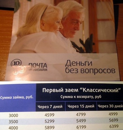 Не буду пересказывать в деталях весь кошмар, который ростовщическое племя в самом жуткой своей ипостаси пытается навязать самым неимущим слоям Российской федерации – в первую очередь, конечно, пенсионерам и молодежи. Очерчу лишь в главных моментах: сознательное умолчание реальной процентной ставки, манипулирование фальшивыми «мнениями счастливых пользователей» (картинки на брошюрах и те брались не из Рунета, а из тошнот американских финансовых порталов), совершенно запредельные условия долговой кабалы – от 168 % годовых до 4599 %, если считать, как считают все банки – с мультипликацией процента).