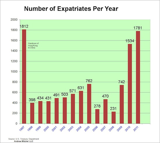 Осталось разобраться со всплеском «предателей родины» 2010 – 2012 г.г. Что такого поменялось в жизни США, что состоятельные люди повалили из страны? Собственно, гадать тут нечего: поменяться мог только баланс Гешефта. Иными словами, обилие негатива – тут тебе и двойное налогообложение, и высокие налоговые ставки, и обамовские налоговые репрессии, и качество жизни в стране с массовой безработицей (той самой – реальной, которая под 25 %, а не липовой официальной – Cole Not Dole), и рост всенародной ненависти к «жирным котам с Уолл Стрит» – достигло такого качества, что этот негатив стал явно перевешивать позитив, который, собственно, сводится для богатого человека лишь к одному – вездесущей защитной длани Дяди Сэма.