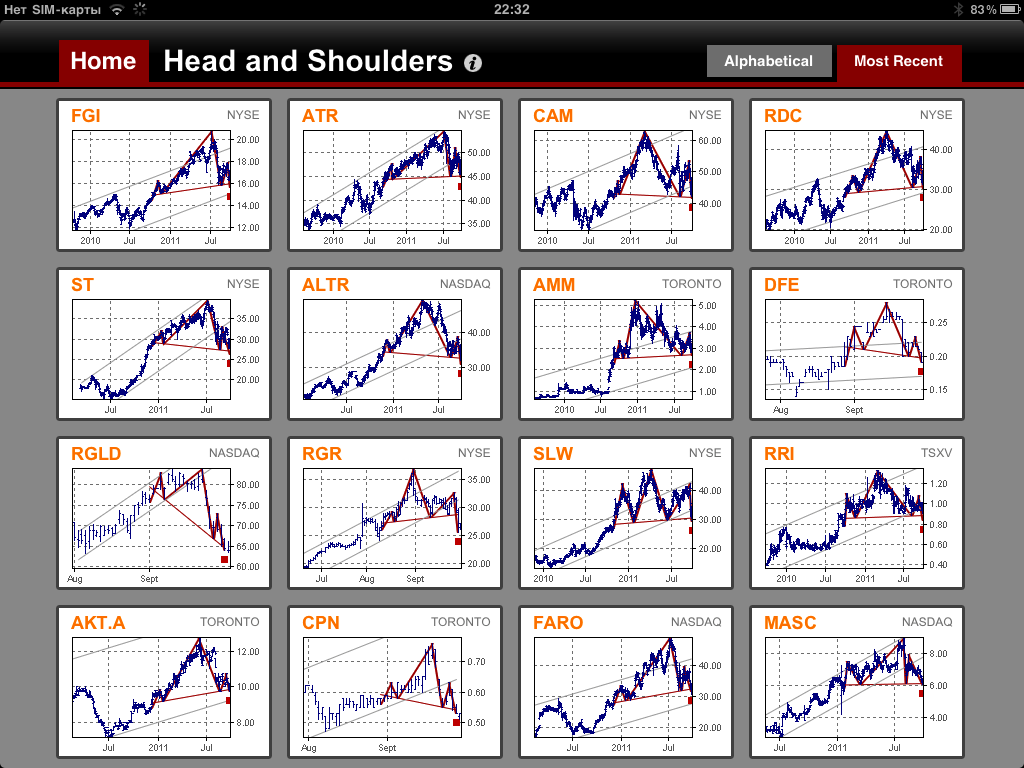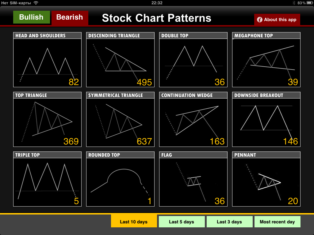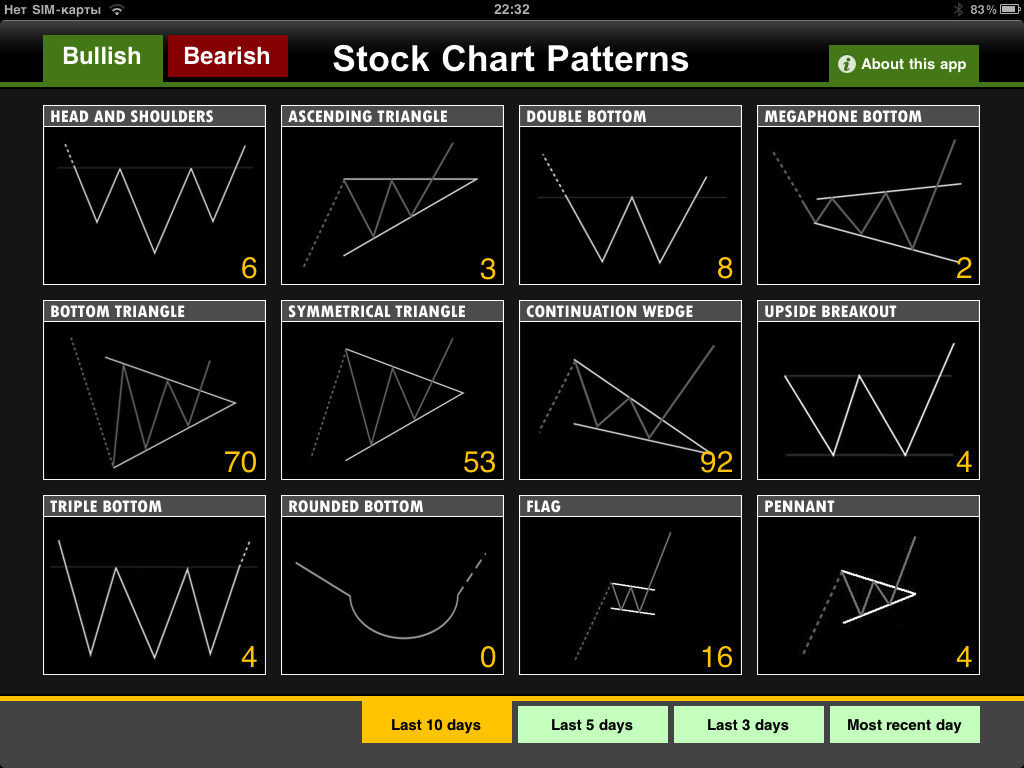 Я сказал, что не знаю достойных программ визуального анализа и оговорился. Я не знал таких программ раньше, зато сегодня уже знаю! И спешу поделиться с читателями находкой. Знакомьтесь: Stock Chart Patterns для iPad. Когда вы узнаете о возможностях этого чуда, вы поймете, что планшет Apple стоит купить хотя бы ради одной этой программы.