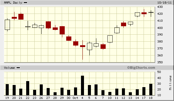 Видите обвал цены с 420 до 370 пунктов? Он приходится аккурат на момент презентации iPhone 4S 4 октября. Весь последующий молниеносный рост и восстановление цены до прежнего уровня свидетельствует об игнорировании рынком виртуальных спекуляций биржевых аналитиков на тему стахановских рекордов в темпах и объемах продаж. Биржа знала о несоответствии iPhone 4S  ожиданиям и желаниям потребителей (всех хотели получить не эволюционную модель, а революцию с новым корпусом в виде iPhone 5), уже пережила это несоответствие и дисконтировало его в цене акций компании.