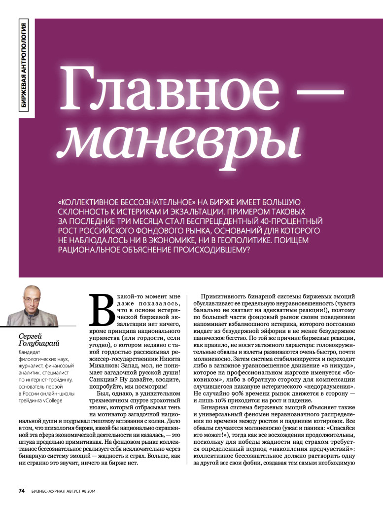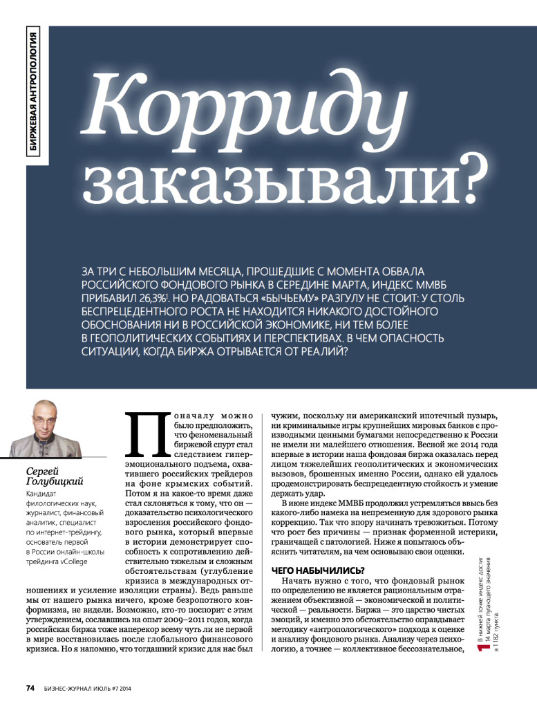 Читать далееНовая рубрика о фондовом рынке в «Бизнес-журнале»? Читатель, не торопись перелистывать страницу! Я не собираюсь толкать тебя на скользкий путь технического анализа и воздействовать мороком «индикаторов», чем так любит заниматься тусовка биржевых аналитиков. Движение фондовых индексов и котировок отдельных бумаг традиционно объясняется через экономические факторы и событийный фон. Мы же пойдем другим путем — через коллективную психологию и мироощущение участников рынка. Чтобы понять скрытые пружины биржи, нам понадобится лишь здравый смысл…