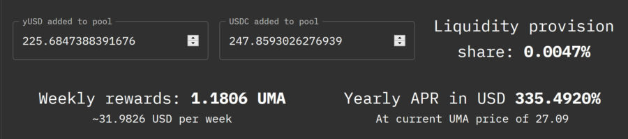 Когда этот пул был создан в конце июля, доходность по нему была около 30% (за счет сложения всех трех компонентов). Сегодня утром доходность была уже 335% годовых. Исключительно благодаря удорожанию токена UMA на бирже (он вырос в цене в 12 раз).