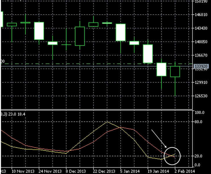 Сигнал о перепроданности рынка и позитивном сломе тренда дали все недельные осцилляторы (на графике простой stochastic с недельным шагом):