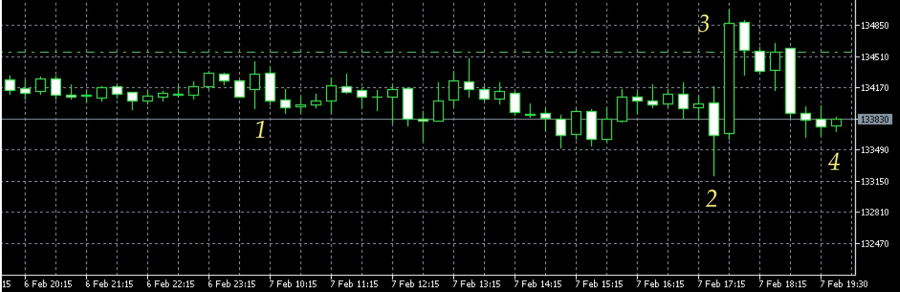 3) Ровно через пять минут происходит фантастическая реверсия и рынок не просто восстанавливается, а взлетает под самые небеса! Думаете, это русские трейдеры вспомнили об Олимпиаде?! Я вас умоляю! Это резко развернулись на положительную территорию американские фьючерсы! Просто там сообразили, что низкая безработица – это хорошо само по себе, а сокращение новых мест вызвано не стагнацией, а именно снижением спроса (той самой безработицы). А главное: Федеральный резерв раньше обещал, что не будет повышать процентную ставку ни при каких обстоятельствах, особо оговорив случай с дальнейшим снижением безработицы. То есть печалиться не о чем и можно продолжать коррекцию (это в Америке);