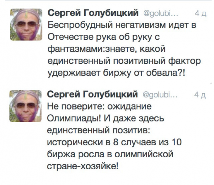 Кто мешал русским трейдерам радоваться Олимпиаде?! Барак Обама? Жидо-массоны? Мировое правительство? Иллюминаты? Рептилии? Мешал проклятый негативизм! Вот за что нужно сажать на нары, а не за гомосексуальные фантазии!