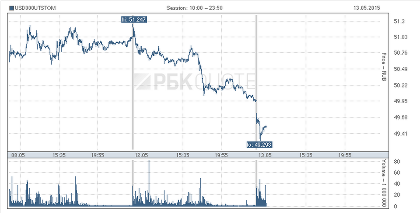 «В воздухе «пахнет» отменой санкций, поэтому неудивителен прорыв 50,00 по USD/RUB на самом открытии торгов и достижение почти 6-месячного минимума на отметке 49,16. В таких благоприятных условиях сильная нефть может отправить пару ещё ниже с ближайшей целью на отметке 48,60», — думает Алёна Афанасьева, аналитик ГК «Форекс Клуб» (Interfax 10:45 13.05.2015).