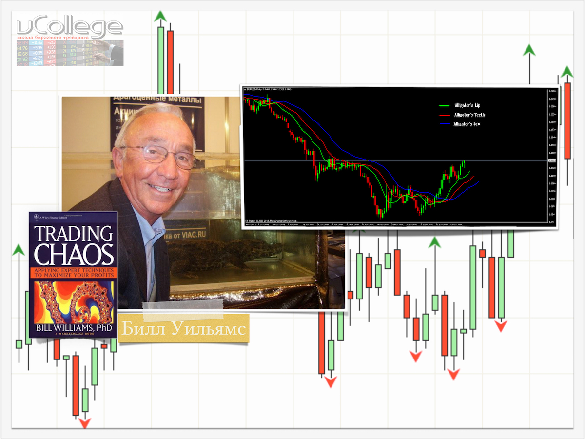 Посмотрим теперь как теория хаоса представлена в современной биржевой практике. Если вы спросите рядовых трейдеров о том, что такое «фрактал», 10 из 10 ответят – система Profitunity Билла Уильямса! Американский журналист, ставший трейдером, в 1995 году написал книгу «Торговый хаос», которая навеки закрепила в биржевом сообществе связь теории Мандельброта с «Аллигатором» (Alligator), Потрясающим осциллятором (Awesome Oscillator), а также «челюстями», «зубами» и «губами» страшной рептилии.
