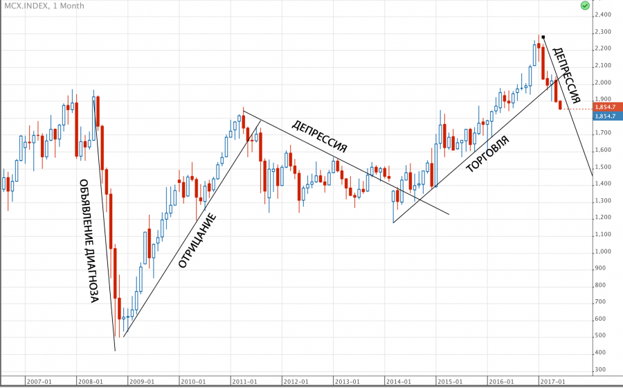 Так вот, то, что мы сейчас видим на фоне очередного ежегодного фестиваля пустословия и словоблудия в Питере, – это финальная жирная точка в процессах Депрессии (2011-2014) и Торговли (2014-2017) неизлечимо больного пациента (терминология Кюблер-Росс, которую мы адаптируем в алгоритме The Trial при анализе фондовых рынков). Отныне российский фондовый рынок уходит в состояние глубочайшей Депрессии, которая растянется по меньшей мере на три года, с неизбежным финалом – касанием индексом ММВБ уровня 2008 года – то есть 500 пунктов.