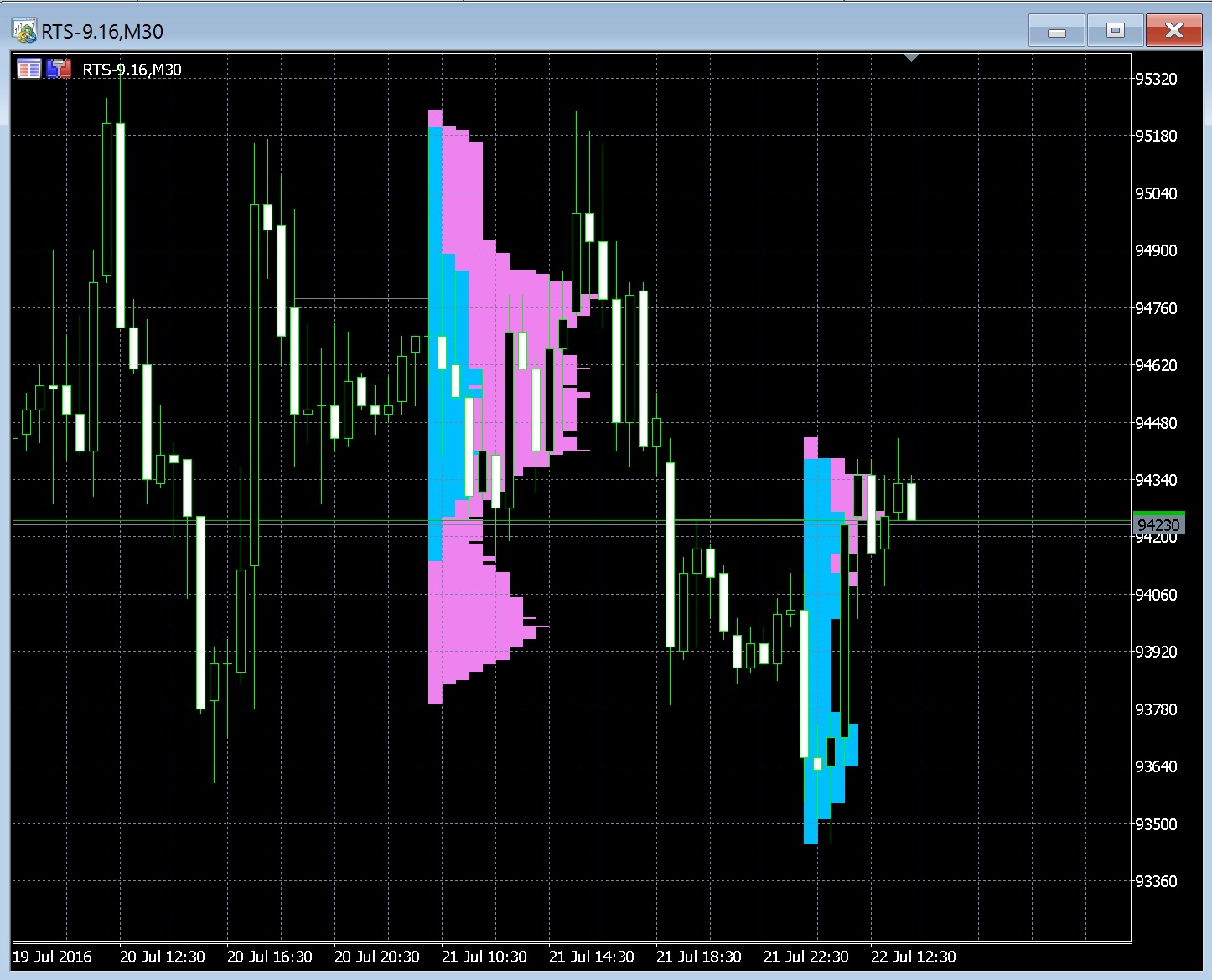 В классическом отображении Market Profile (то есть так, как это предложил делать Питер Стедлмайер) используются буквы английского алфавита: ЗАГЛАВНЫЕ (для данных дневной сессии) и строчные (для вечерней сессии). В зависимости от программного обеспечения сегодня можно встретить как классическую форму Market Profile, так и цветные гистограммы. Например, так.