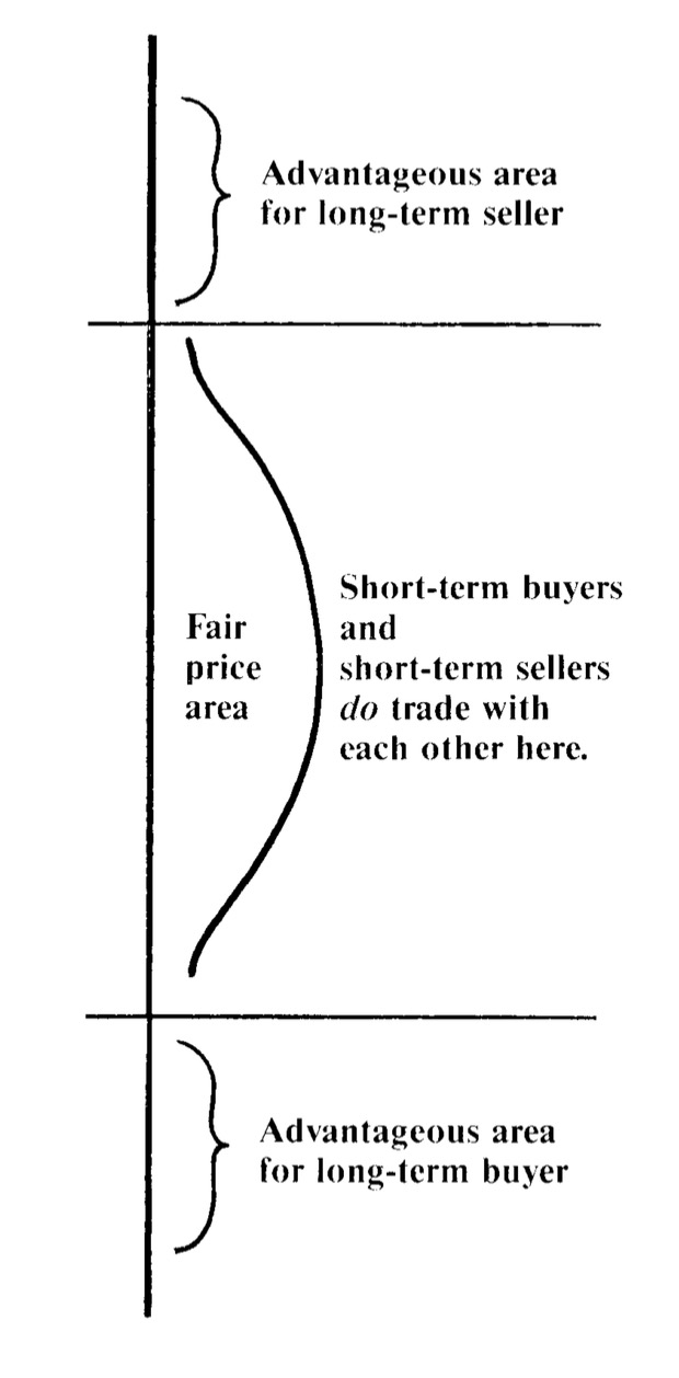 Первое практическое применение, которое мы можем извлечь из Market Profile: в зависимости от распределения зон мы можем соотнести разные диапазоны с активностью разных трейдеров: зоны за пределами ценовой привлекательности обслуживают долгосрочных покупателей и продавцов, сама зона ценовой привлекательности предназначена для активности краткосрочных трейдеров (дей-трейдеров):