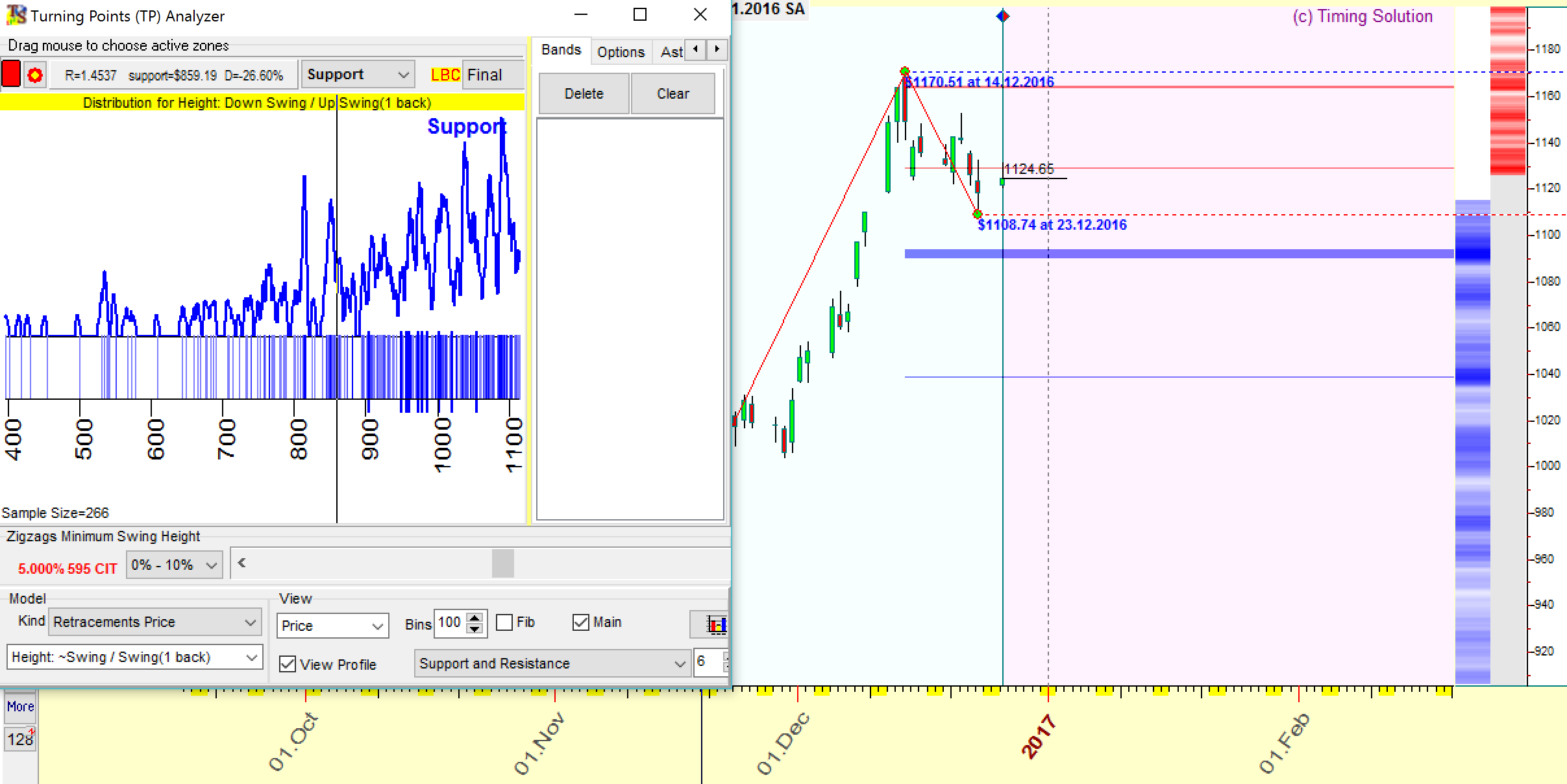 График индекса РТС по состоянию на конец 2016 года, с нанесёнными на него органическими уровнями сопротивления на 1164 пунктах (красная линия) и поддержки на 1091 (синяя линия), полученными в результата анализа разворотных точек в программе Timing Solution.