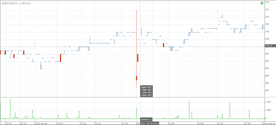 Сказочный российский фондовый рынок: пришёл “трейдер” и купил за 697 рублей аж … 1 акцию “РосАгро” (не хухры-мухры, а огромная компания!)! А потом пришёл ещё один “трейдер” и тоже купил 1 акцию, но уже за – страшно сказать! – 698 рублей! А потом ещё пришёл и купил целых ТРИ акции! Биржо, чо там!